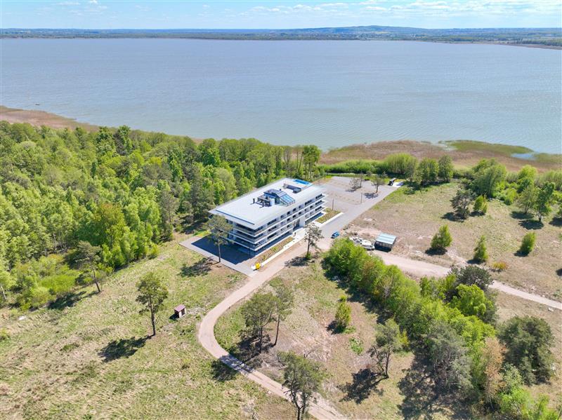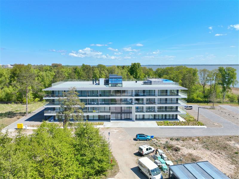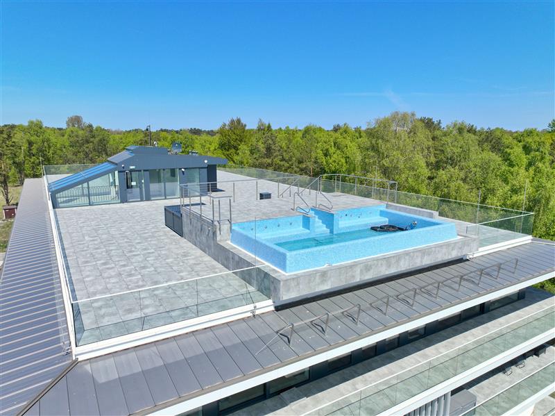 - Dodatkowe udogodnienia: Duży taras z widokiem na las stanowi idealne miejsce do relaksu, a zewnętrzny basen na dachu budynku oferuje unikalne doznania w połączeniu z pięknym widokiem na jezioro oraz okolicę.