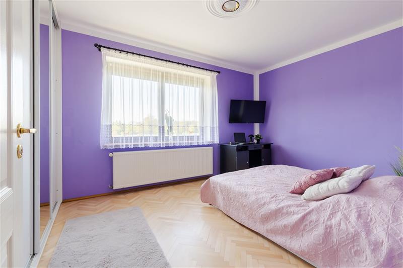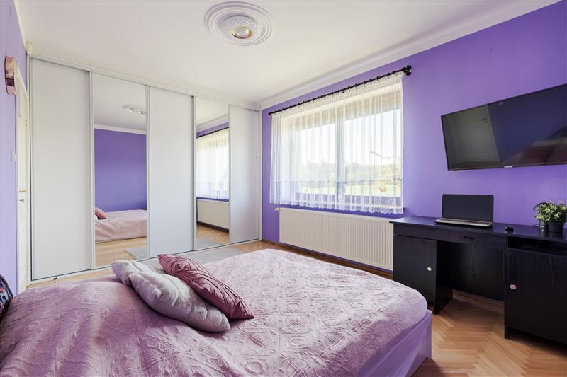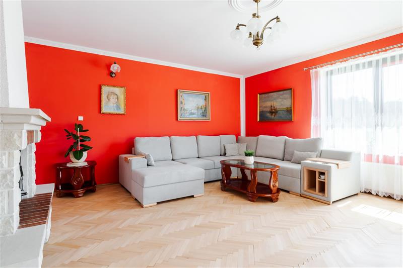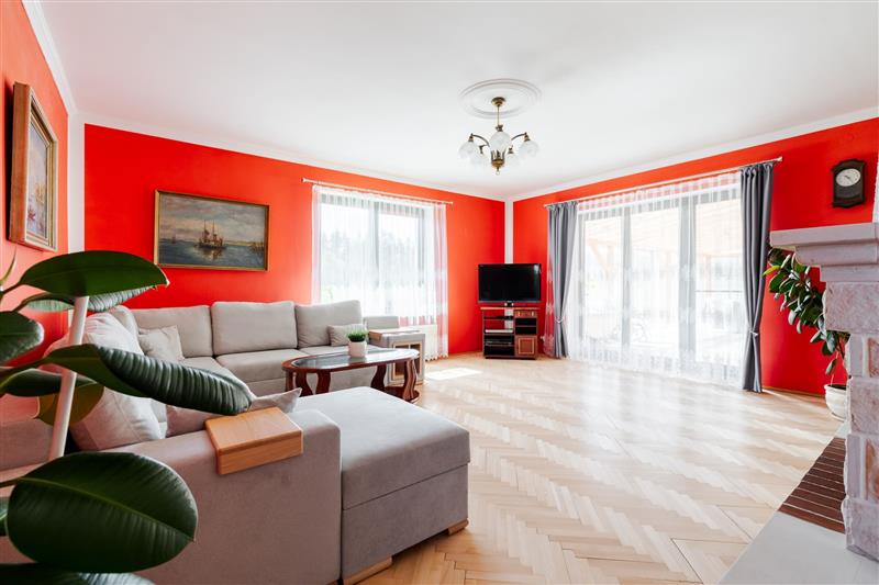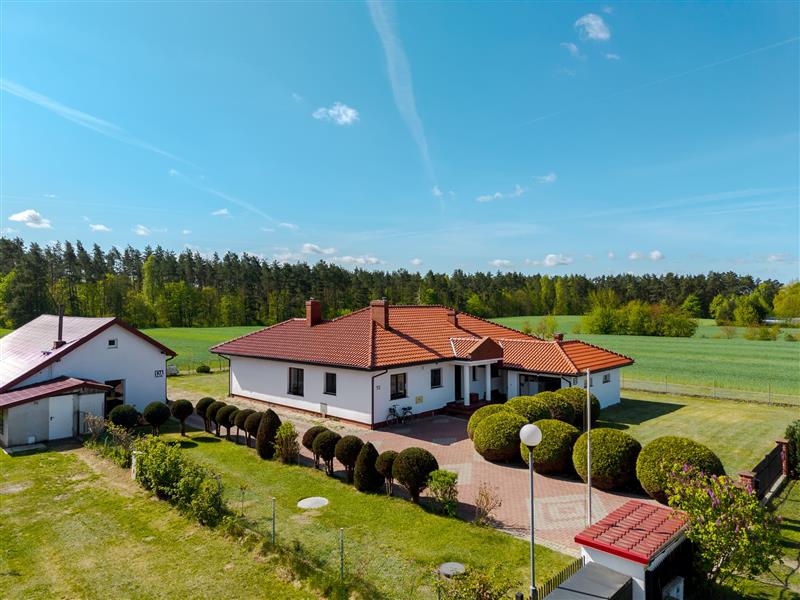 * Ogród i otoczenie: przed domem utwardzona część posesji wyłożona estetycznym polbrukiem. Obok znajduje się zadbany ogród z perfekcyjnie utrzymaną trawą, licznymi nasadzeniami oraz starannie przystrzyżonymi krzewami i drzewami owocowymi. Całość tworzy harmonijną przestrzeń sprzyjającą wypoczynkowi. Wokół rozpościera się widok na rozległe pola i ściany lasu, co zapewnia prywatność i niepowtarzalny klimat.