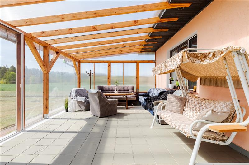 * Taras zabudowany (ok. 47 m2) wyłożony terakotą – strefa medytacji i wyciszenia: rankiem wschód słońca nad polami, wieczorem śpiew ptaków, wśród aksamitnych cieni drzew. To idealne miejsce, by wsłuchać się w szum liści i poczuć jedność z naturą.