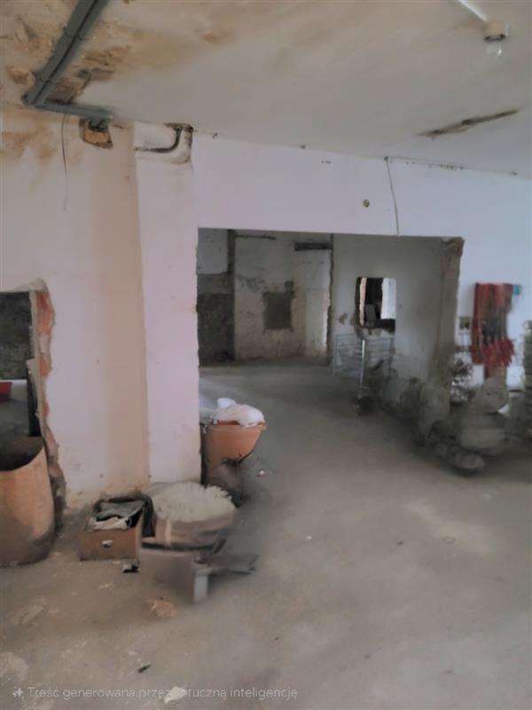 Parter - lewa strona - obecnie sklep o pow. około 200m2. Składa się z dużej sali sprzedaży, biur, zaplecza i sanitariatu. Woda z podgrzewacza, ogrzewanie gazowe, wg oświadczenia właściciela – piec 5 letni firmy Viessmann, który ogrzewa cały parter.