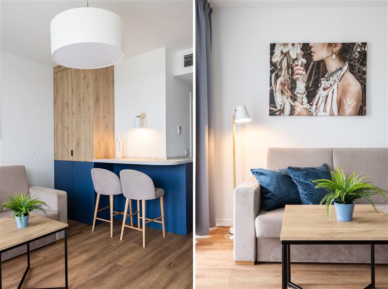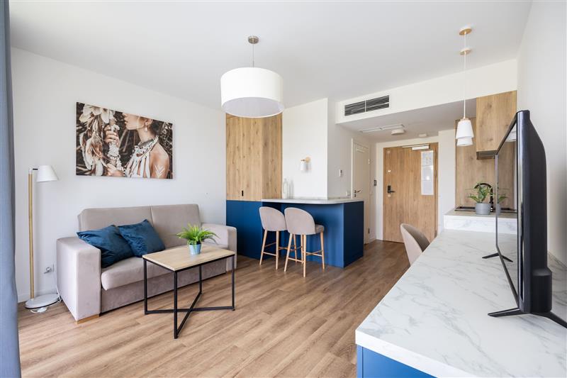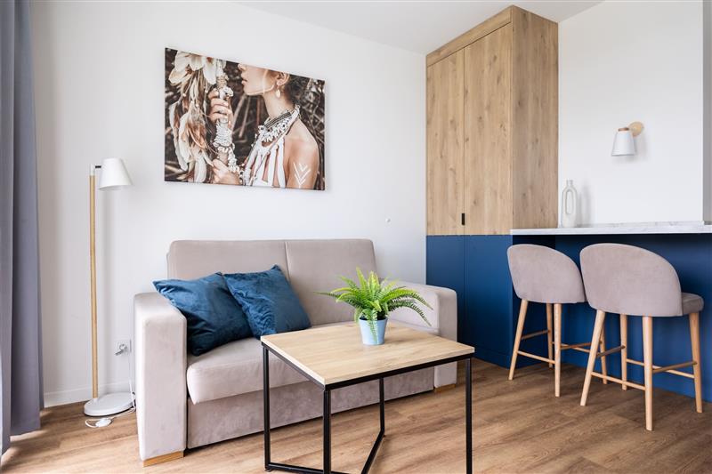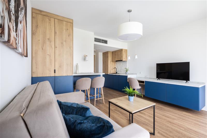 Mieszkanie jest sprzedawane z pełnym wyposażeniem, w tym sprzętem AGD renomowanych marek, a także meblami. Obejmuje to również system klimatyzacji z funkcją grzania, nowoczesne drzwi zewnętrzne z elektronicznym zamkiem oraz wideodomofon.
