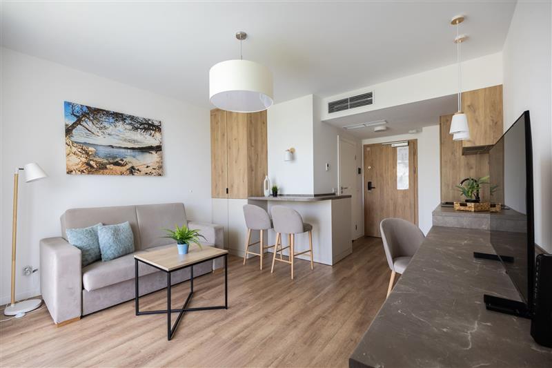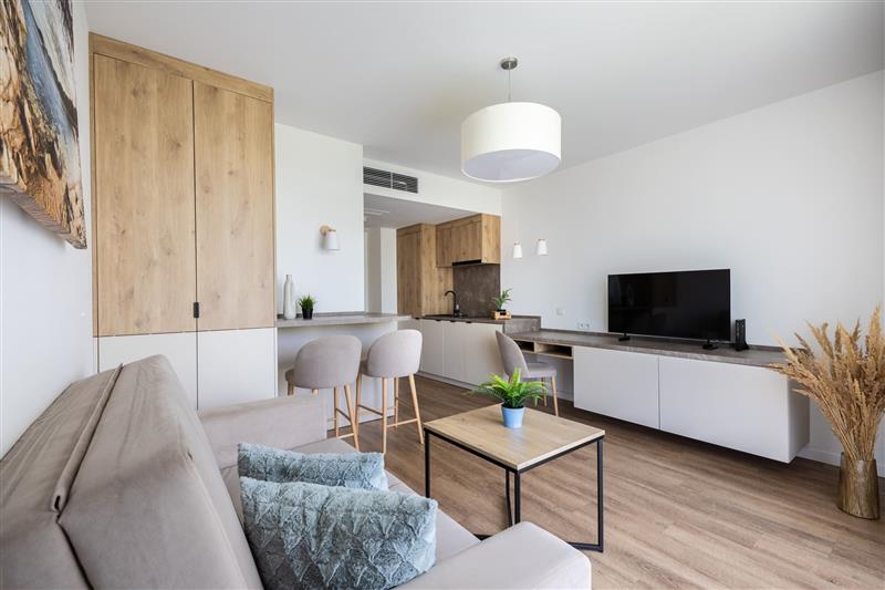 Mieszkanie jest sprzedawane z pełnym wyposażeniem, w tym sprzętem AGD renomowanych marek, a także meblami. Obejmuje to również system klimatyzacji z funkcją grzania, nowoczesne drzwi zewnętrzne z elektronicznym zamkiem oraz wideodomofon.