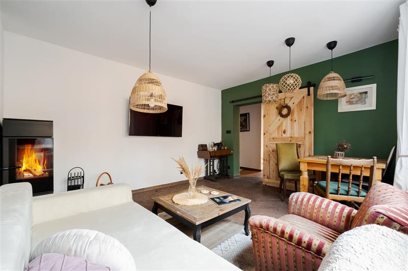 - W salonie meble w zabudowie, kominek oraz narożnik z funkcją spania.