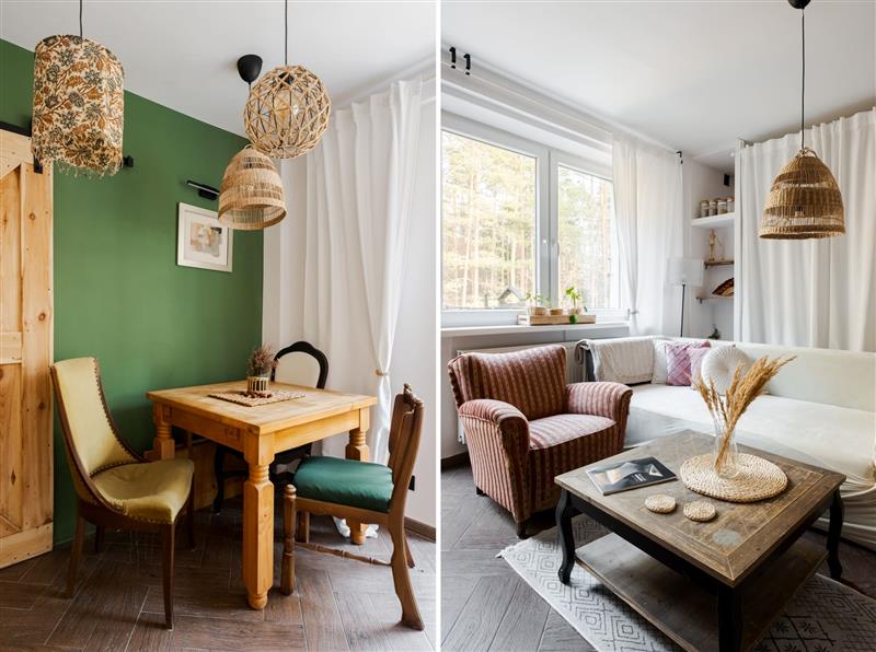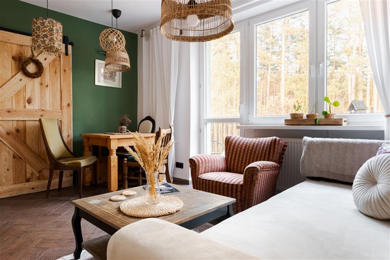 - Salon z wyjściem na balkon, z którego rozciąga się widok na las.