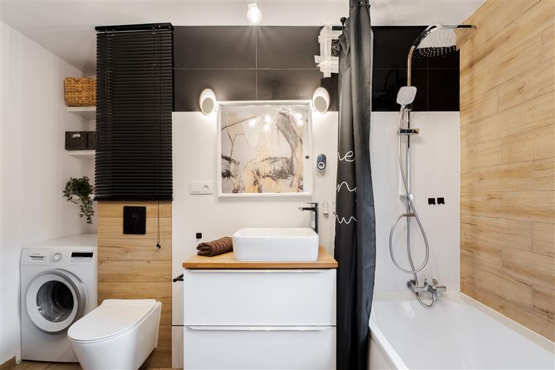 - Łazienka z wanną i oknem, w pełni wyposażona, pralka (po demontażu wanny uzyskuje się obszerny natrysk z odpływem w posadzce).