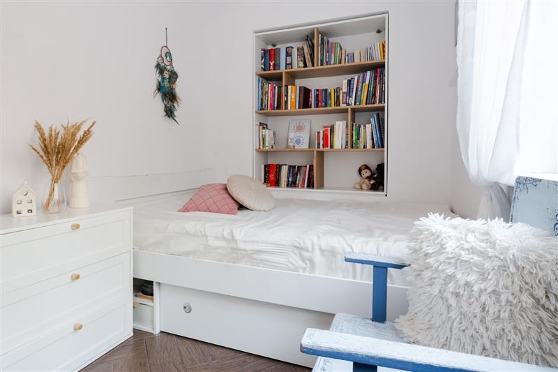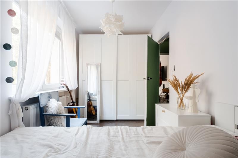 - Sypialnia z pełnym umeblowaniem (szafa, łóżko 160 cm, wnęka na biblioteczkę).