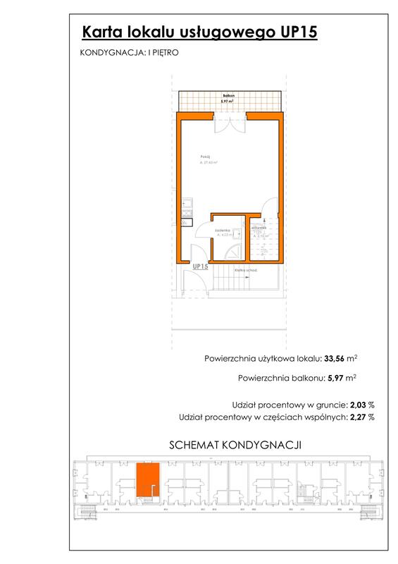 Przedstawiamy lokal o pow. 33,56m2 o funkcjonalnym układzie pomieszczeń, w skład którego wchodzi duży salon z aneksem kuchennym (27,43m2), łazienka z prysznicem (4,03m2) oraz wc ze schowkiem (2,10m2). Z salonu wyjście na słoneczny balkon o pow. 5,97m2.