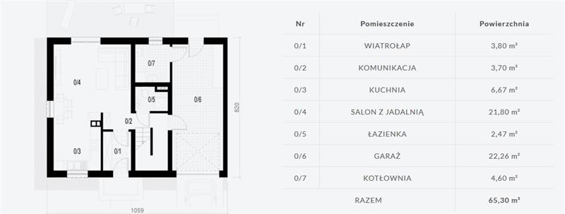 Rozkład pomieszczeń: kuchnia (6,67 m2), salon połączony z jadalnią ( 21,80m2), 3 pokoje (11,10m2; 12,72m2; 5,03m2), łazienka (8,27m2), wc (2,47m2), wiatrołap (3,80m2), komunikacja (3,70m2; 5,60m2), sypialnia z garderobą (17,28m2), garaż (22,26m2) oraz kotłownia (4,60m2). Dodatkowo od strony ogrodu projekt został wzbogacony o 22 m2 tarasu.