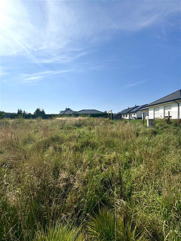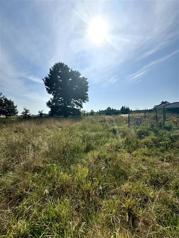 Działka o powierzchni 1206m2 w kształcie trapezu. Teren suchy, porośnięty trawą.