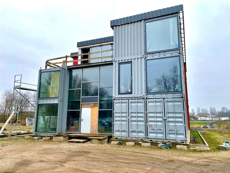 Na działce obecnie postawiona jest część biurowa z elementów stalowych ( z wykorzystaniem kontenerów transportowych typu morskiego) w stanie surowym zamkniętym z wykonaną elewacją. W środku częściowo wykonane ścianki działowe wraz z tynkami. Posadzka-podkład cementowy 4cm. Dla doświetlenia pomieszczeń zastosowana okna stałe i otwierane, aluminiowe. Stolarka drzwiowa- aluminiowa i drewniana. Dach płaski z pokryciem z membrany termozgrzewalnej na warstwie wełny mineralnej laminowanej gr. Min. 20cm. Część biurowo-socjalna to trzy kondygnacje, bez podpiwniczenia, która składa się z zespołu szatniowego, pomieszczenia sanitarnego i technicznego.