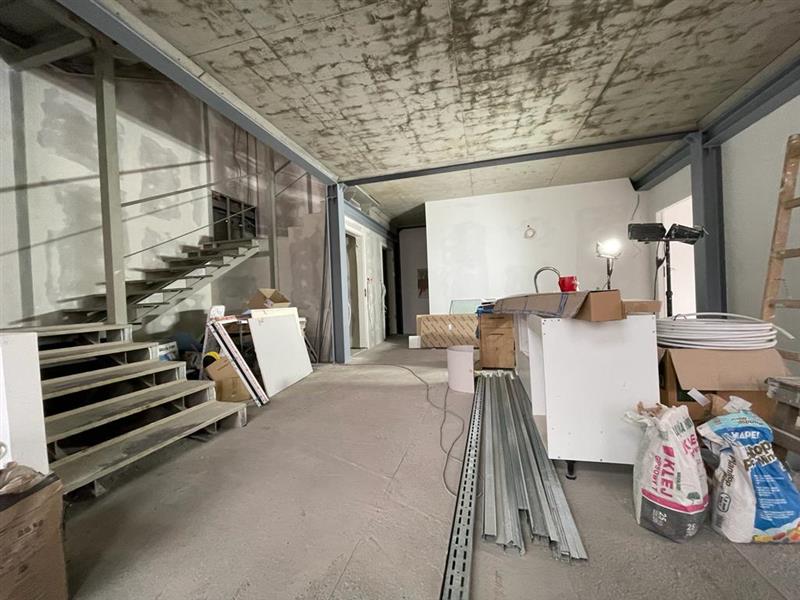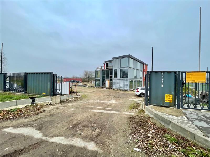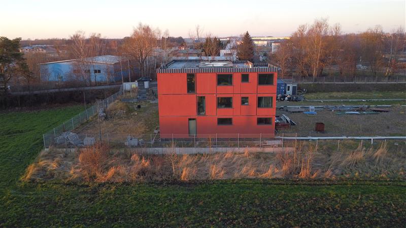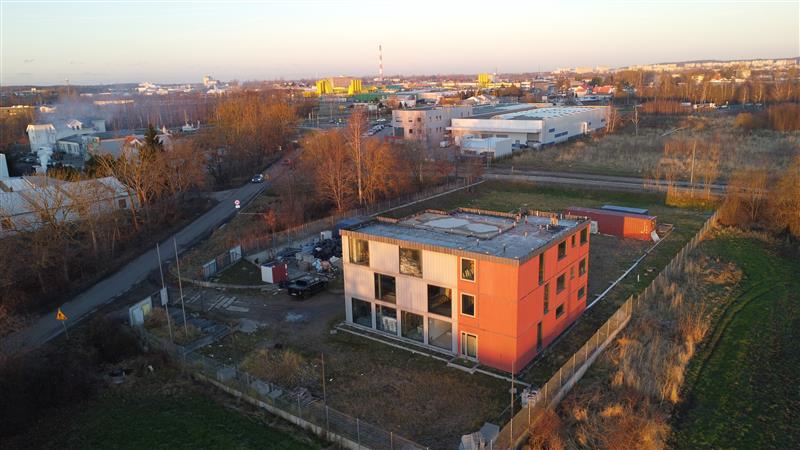 Obecnie postawiona jest część biurowa z elementów stalowych ( z wykorzystaniem kontenerów transportowych typu morskiego) w stanie surowym zamkniętym z wykonaną elewacją. W środku częściowo wykonane ścianki działowe wraz z tynkami. Posadzka-podkład cementowy 4cm. Dla doświetlenia pomieszczeń zastosowana okna stałe i otwierane, aluminiowe. Stolarka drzwiowa- aluminiowa i drewniana. Dach płaski z pokryciem z membrany termozgrzewalnej na warstwie wełny mineralnej laminowanej gr. Min. 20cm. Część biurowo-socjalna to trzy kondygnacje, bez podpiwniczenia, która składa się z zespołu szatniowego, pomieszczenia sanitarnego i technicznego.
