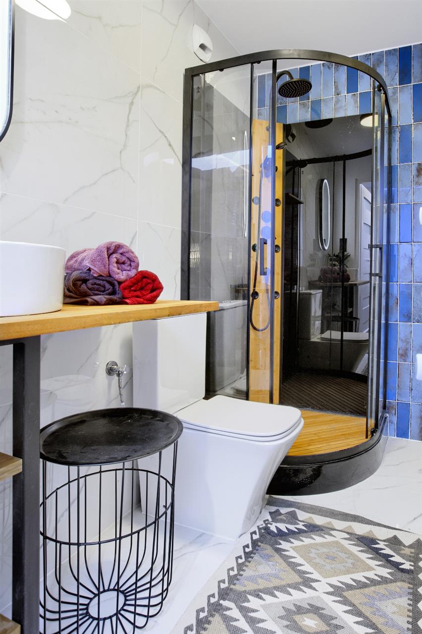 - Układ pomieszczeń: 1 pokój z aneksem kuchenny oraz łazienka z prysznicem
