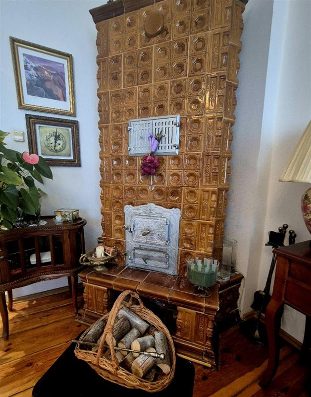 Salon wyposażony w oryginalny piec kaflowy.