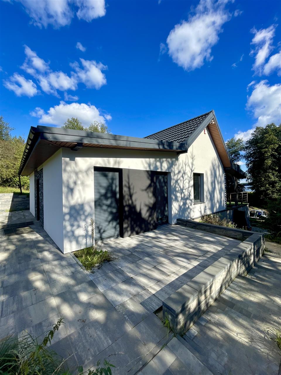 - Przestronny salon z dużymi przeszkleniami prowadzi na 50-metrowy taras z panoramicznym widokiem na taflę jeziora — idealny na poranną kawę, rodzinne spotkania czy romantyczne zachody słońca,
