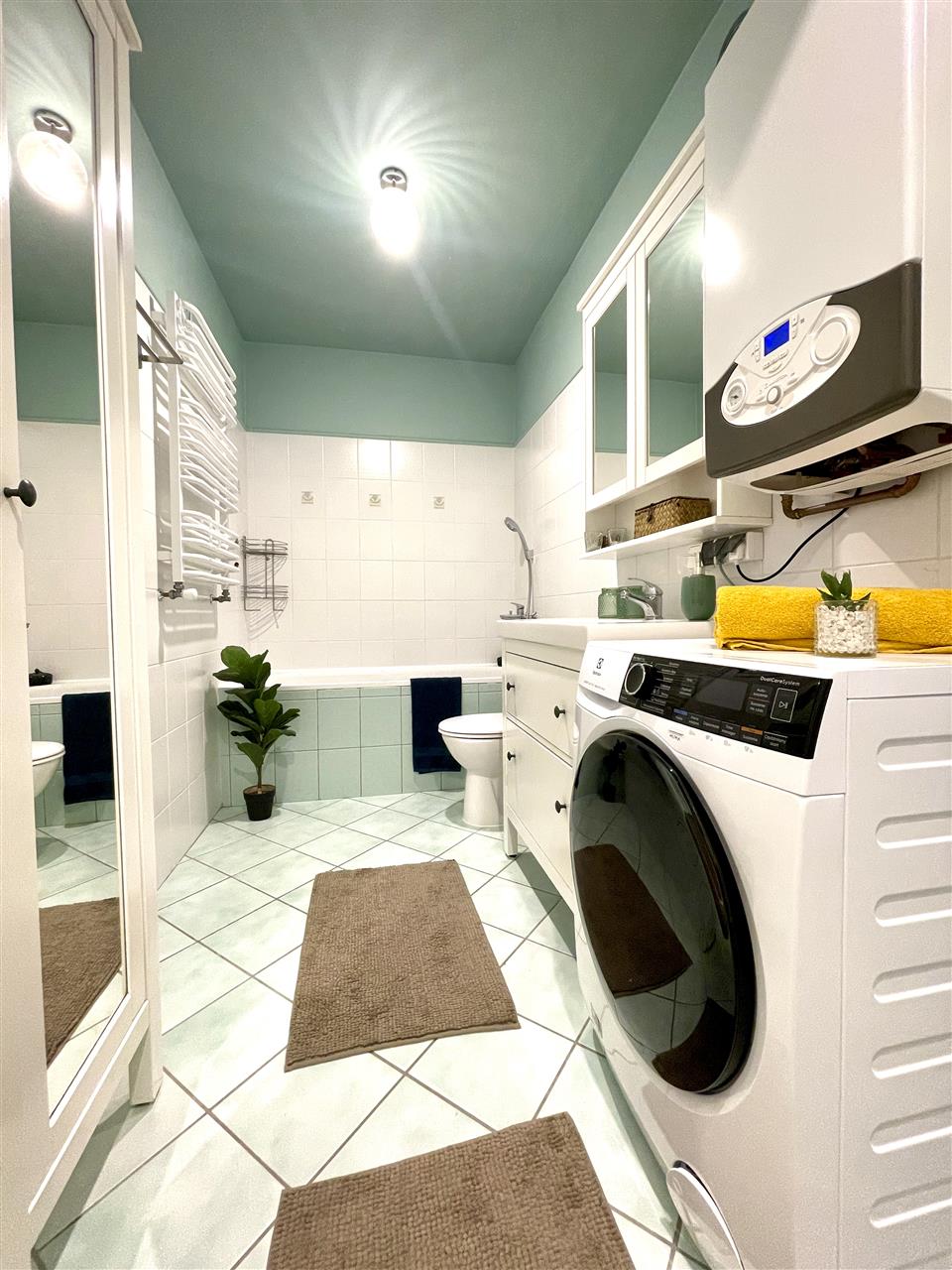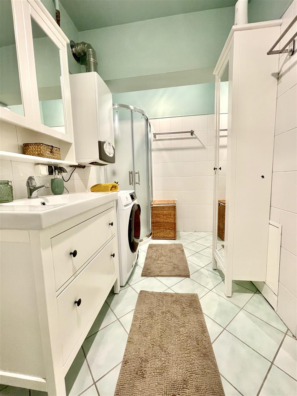 - Łazienka – przestronne wnętrze z kabiną prysznicową i wanną