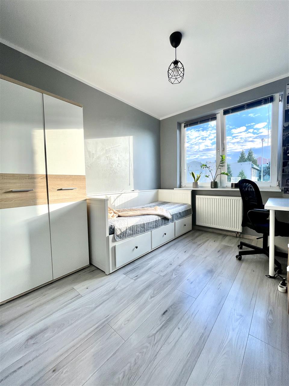 - Część prywatną (nocną) – trzy przytulne sypialnie, idealne dla rodziny z dziećmi lub osób pracujących zdalnie.