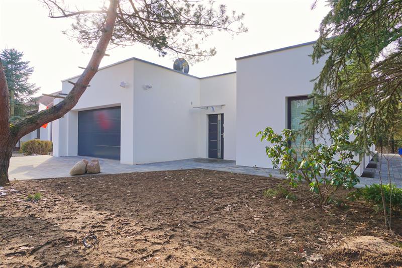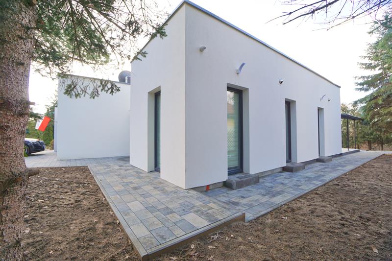 Nowy parterowy budynek o powierzchni użytkowej 139m2, o nowoczesnej bryle z płaskim dachem, najnowsze rozwiązania grzewcze.