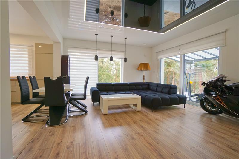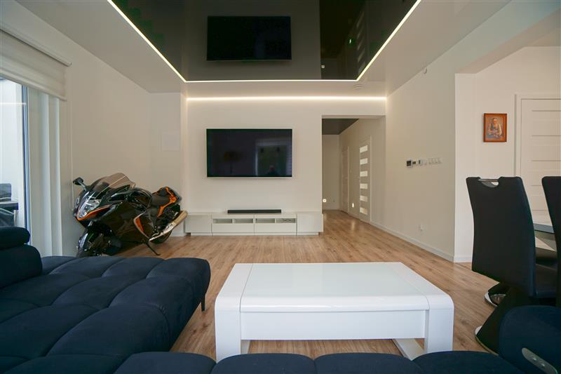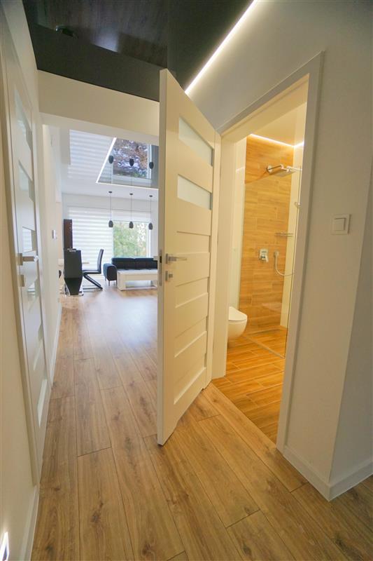 Sufity napinane w każdym pomieszczeniu o zróżnicowanej strukturze kolorystycznej ( w kuchni biały mat, w salonie białe elementy z czarnym w połysku, korytarze czarne, łazienki białe). Oświetlenie led wykorzystane w aranżacji wnętrza sterowane z poziomu aplikacji. Na podłogach panel oraz terakota w wiatrołapie i łazienkach. Łazienki wykonane w nowoczesnej aranżacji, jasne elementy łączone z drewnopodobną glazurą lub ciemną płytką. Ściany w kolorze białym.