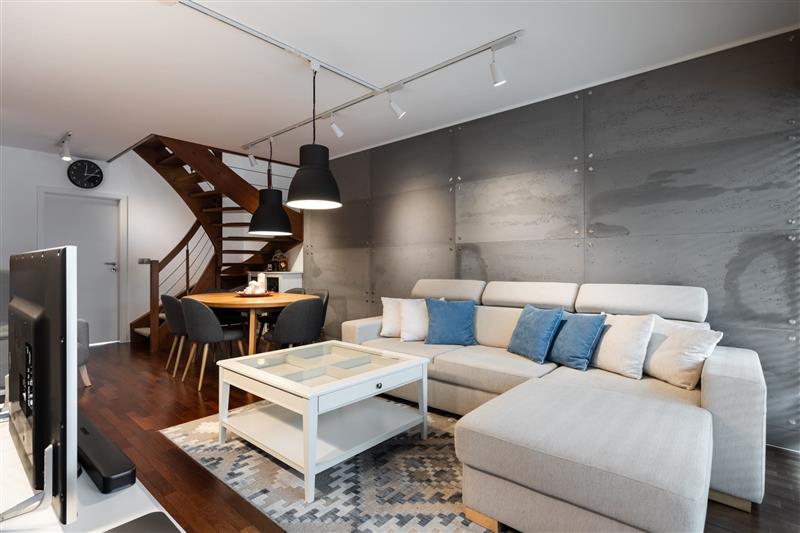 Na ścianach gładzie w kolorze w salonie płyty betonowe dekoracyjne.