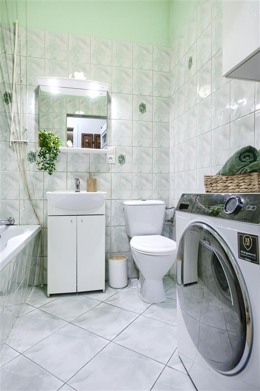 Łazienka w stanie użytkowym, z wanną. Występuje drobna usterka związana z odpływem pralki – jej dokładna diagnoza możliwa jest przy ewentualnym remoncie łazienki. Obecnie rozwiązanie umożliwia normalne użytkowanie.