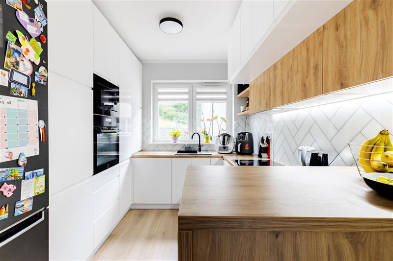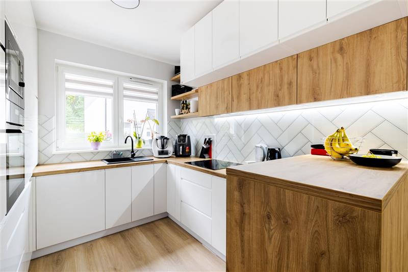 Ściany wygładzone, pomalowane w kolorze, w salonie jedna ze ścian wykonana w farbie strukturalnej. Na parterze podłoga winylowa, w łazience i wiatrołapie terakota, w pozostałych pomieszczeniach panele.
