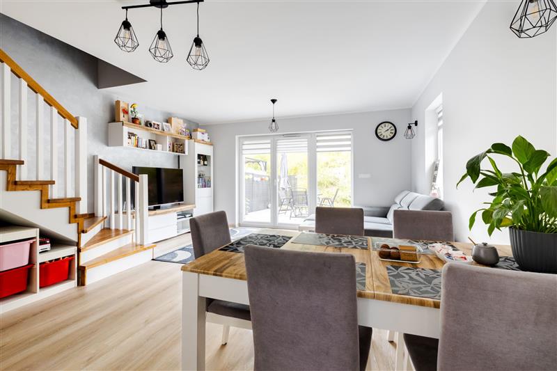 Na parterze znajduję się salon z wyjściem na taras, jadalnia, aneks kuchenny, wiatrołap oraz WC, wejście na piętro schodami jesionowymi wykonanymi pod wymiar.