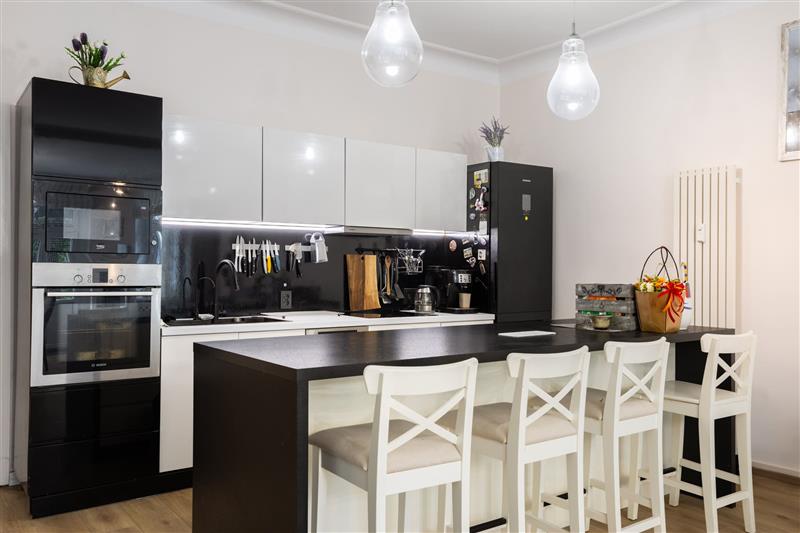 W mieszkaniu zachowano oryginalne elementy kamienicy. Stylowe drzwi z ozdobnym oświetleniem, a schody wykończono