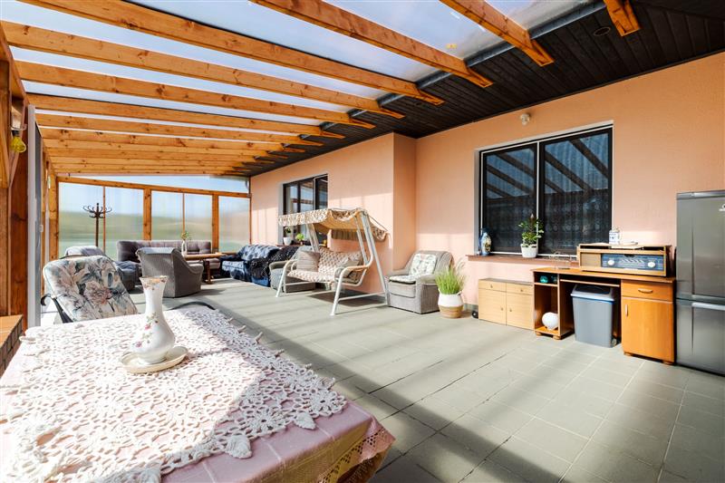 Zabudowany taras ok. 47 m2, wyłożony terakotą - świetne miejsce do wypoczynku, pracy lub spokojnego poranka z widokiem na naturę. Otoczenie domu jest zadbane: utwardzony podjazd (polbruk), ogród z nasadzeniami, krzewami i drzewami owocowymi.