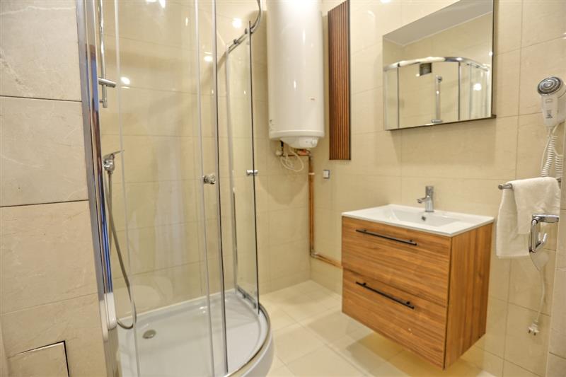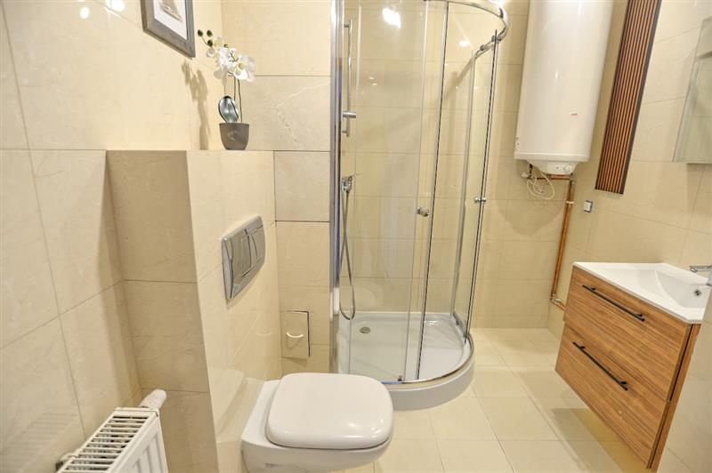 Łazienka wyposażona jest w kabinę prysznicową, umywalkę z szafką oraz bojler odpowiadający za podgrzewanie ciepłej wody. W przedpokoju znajduje się praktyczna szafa w zabudowie, zapewniająca miejsce do przechowywania bez zajmowania powierzchni części dziennej.